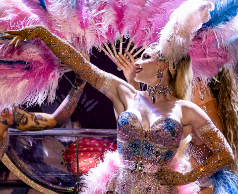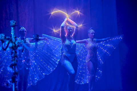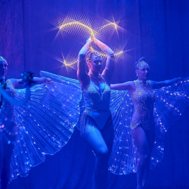 - Klasická burleska – šestiminutový klenot ve vintage estetice s péřovými vějíři, boa a LED křídly. Funguje i v menších prostorách.