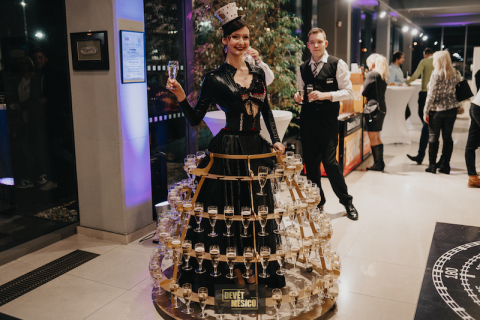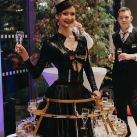 Představujeme vám luxusní pětihvězdičkový hostesčin nové generace. Designový stojan na kolečkách se skleničkami na šampaňské, či víno dodá vašemu eventu jedinečnou atmosféru. Stojan ve zlaté barvě doplní naše krásná hosteska v šatech a kostýmech na přání. Součástí je samozřejmě i tematický make-up. Kapacita stojanu je až 114 skleniček. Cena je uvedena bez skleniček a bez sektu.